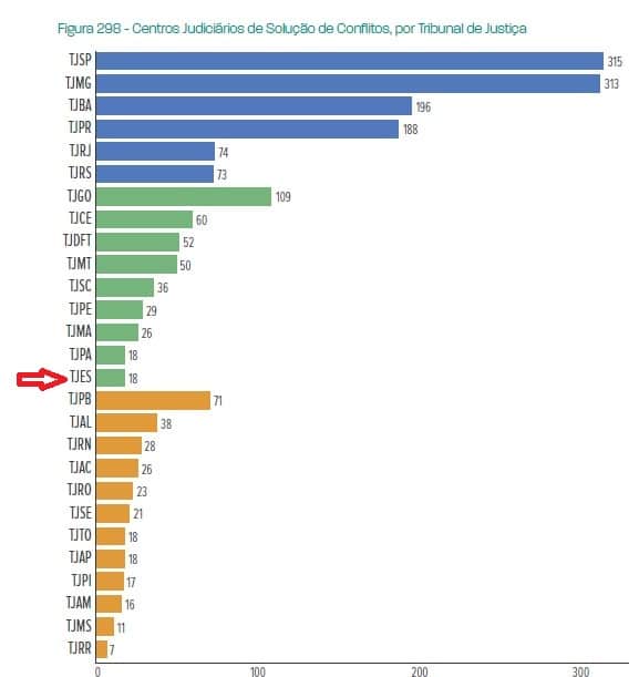 Porém, com 18 Centros Judiciários de Solução de Conflitos, O TJES é o 5º tribunal estadual do país com menos centros desse tipo. Entre os 9 de médio porte, é o que tem a menor quantidade.