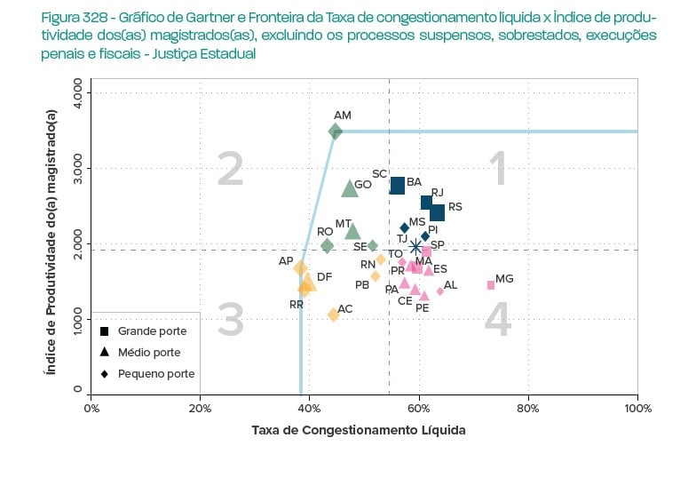 Os tribunais no segundo quadrante são aqueles com melhor desempenho, pois combinaram altos indicadores de produtividade com menor taxa de congestionamento líquida. Já os que se encontram no quarto quadrante estão mais distantes da fronteira e se associam à alta taxa de congestionamento líquida com baixos níveis de produtividade. O TJES se encontra no quarto quadrante: combina alta taxa de congestionamento com baixo Índice de Produtividade dos Magistrados.