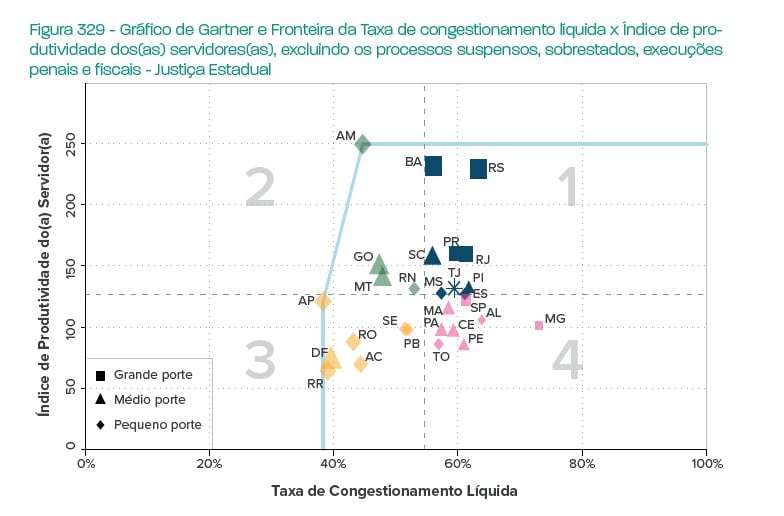 Assim como no gráfico anterior, os tribunais no segundo quadrante são aqueles com melhor desempenho, pois combinaram altos indicadores de produtividade com menor taxa de congestionamento líquida. Já os que se encontram no quarto quadrante estão mais distantes da fronteira e se associam à alta taxa de congestionamento líquida com baixos níveis de produtividade.
