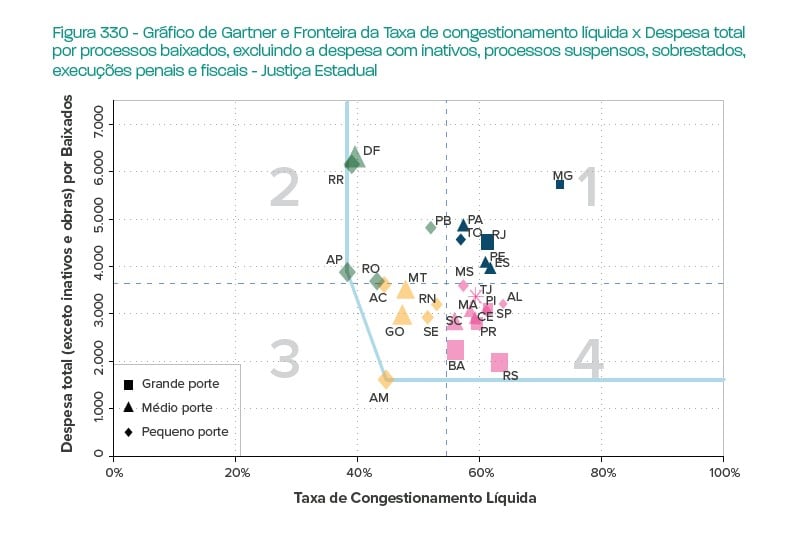 Os tribunais no terceiro quadrante da figura de despesa são aqueles com melhor desempenho, pois combinaram baixos índices de despesa com menor taxa de congestionamento líquida. Já os que se encontram no primeiro quadrante de despesa estão mais distantes da fronteira e se associam à alta taxa de congestionamento líquida com alto volume de despesa. O TJES se localiza exatamente aí: no primeiro quadrante.