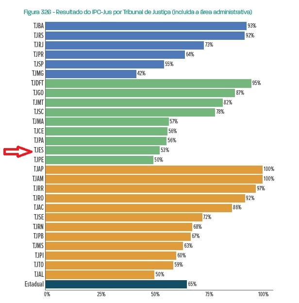 No relatório anterior (ano-base 2023), o TJES havia ficado na 3ª pior colocação, com IPC-Jus de 49%. Não mudou muito, portanto.