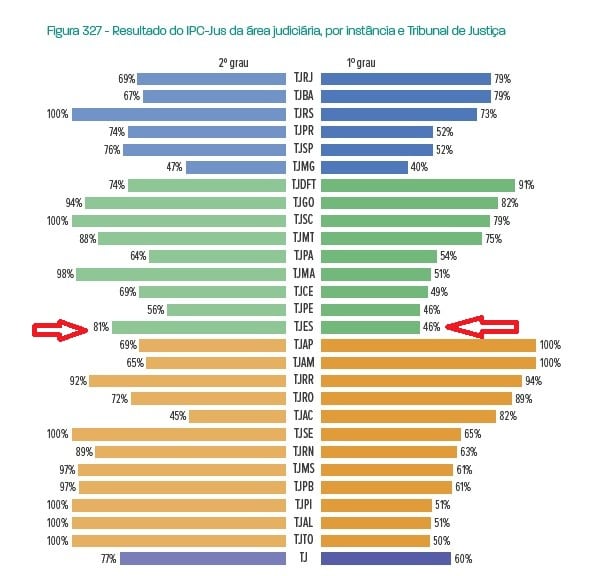 Já na 1ª instância, a situação é muito pior: com IPC-Jus de 46%, a Justiça Estadual do Espírito Santo tem o 2º pior resultado do país, empatando com o TJPE e superando apenas o TJMG (40%). A média nacional no 1º grau é de 60% (muito acima do índice obtido pelo tribunal capixaba).