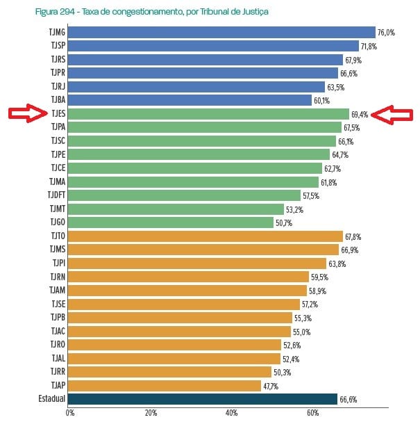 A taxa de congestionamento do TJES, 69,4%, é a terceira maior do país, só abaixo das taxas do TJSP e do TJMG (ambos, tribunais de grande porte). Trata-se da maior taxa entre os 9 tribunais de médio porte.